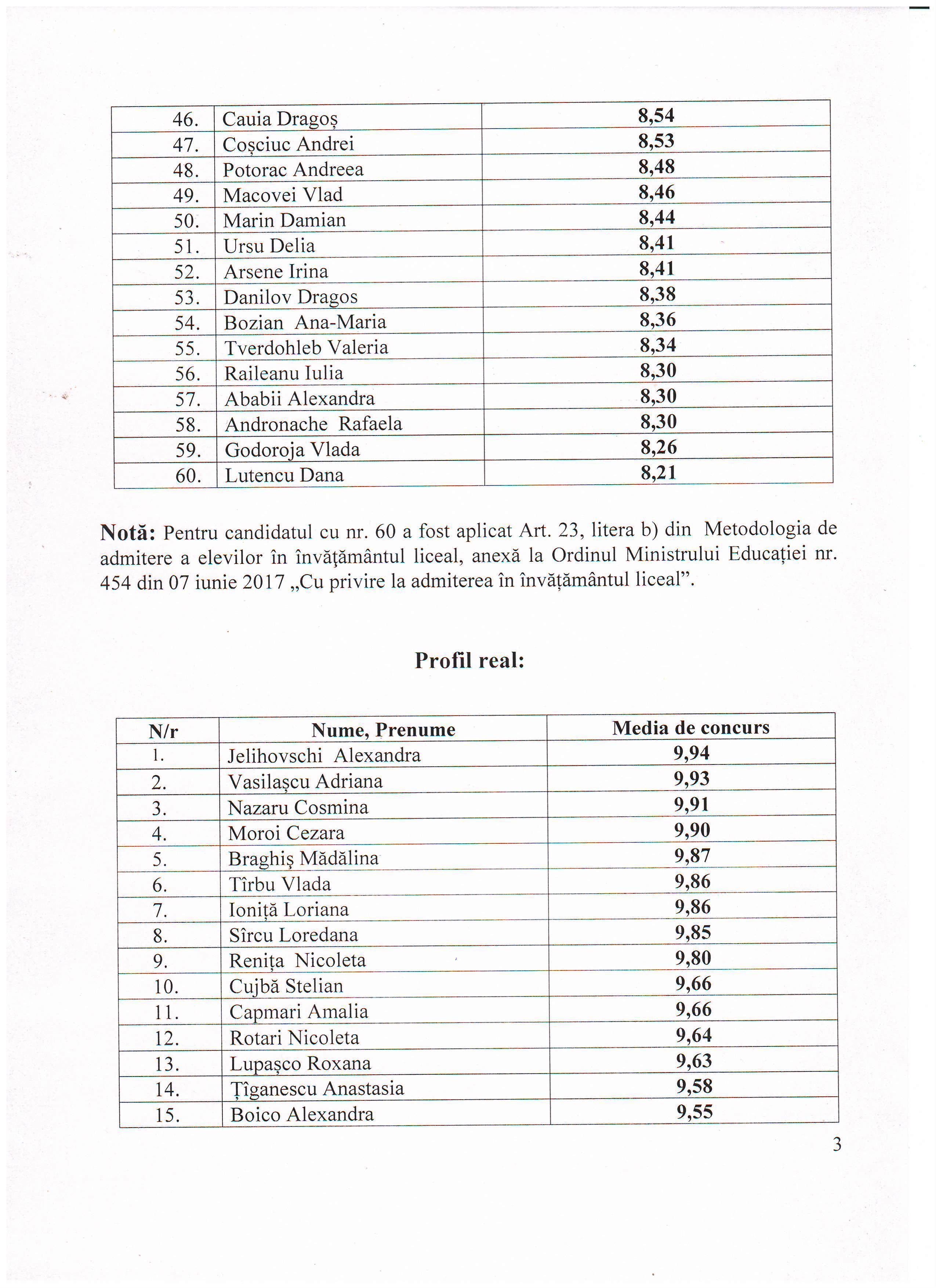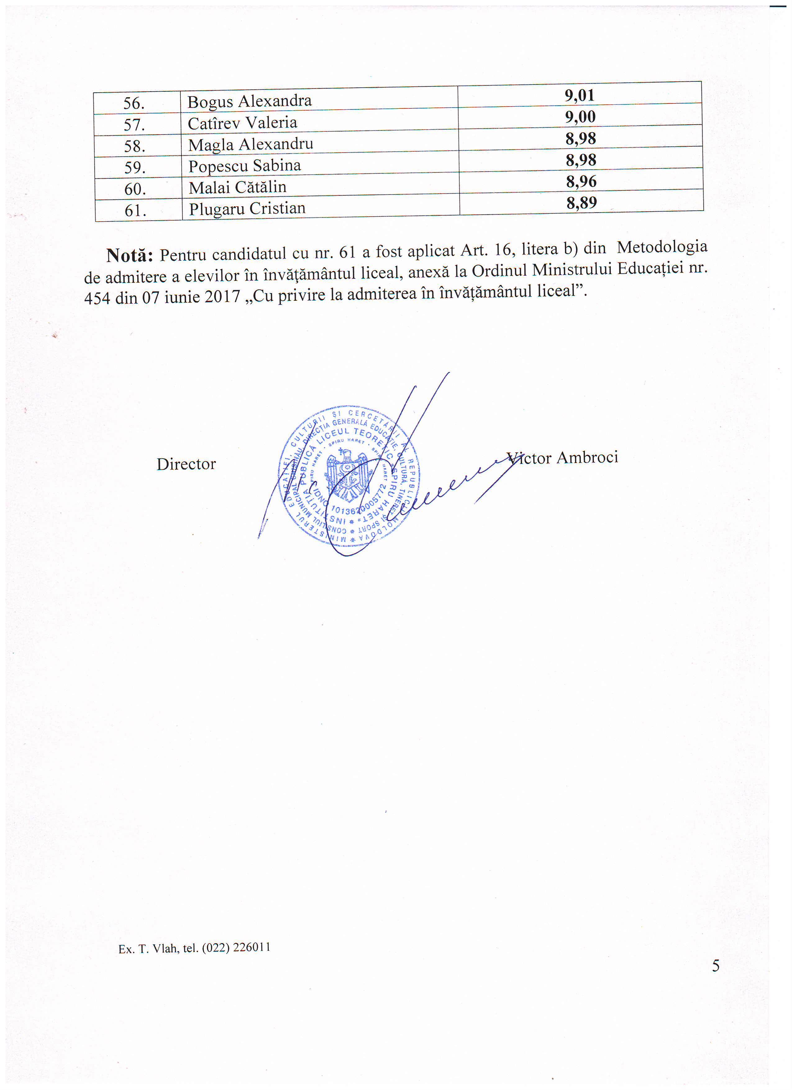 NOTĂ: MEDIILE DE CONCURS AU FOST CALCULATE CONFORM ARTICOLULUI 21 DIN METODOLOGIA DE ADMITERE A ELEVILOR ÎN ÎNVĂȚĂMÂNTUL LICEAL, FĂRĂ ROTUNJIRI. ACESTEA POT SĂ COINCIDĂ CU MEDIILE DE PE PLATFORMA escoala.chisinău.md SAU POT SĂ DIFERE CU +/- 0,01 DE ACESTEA.