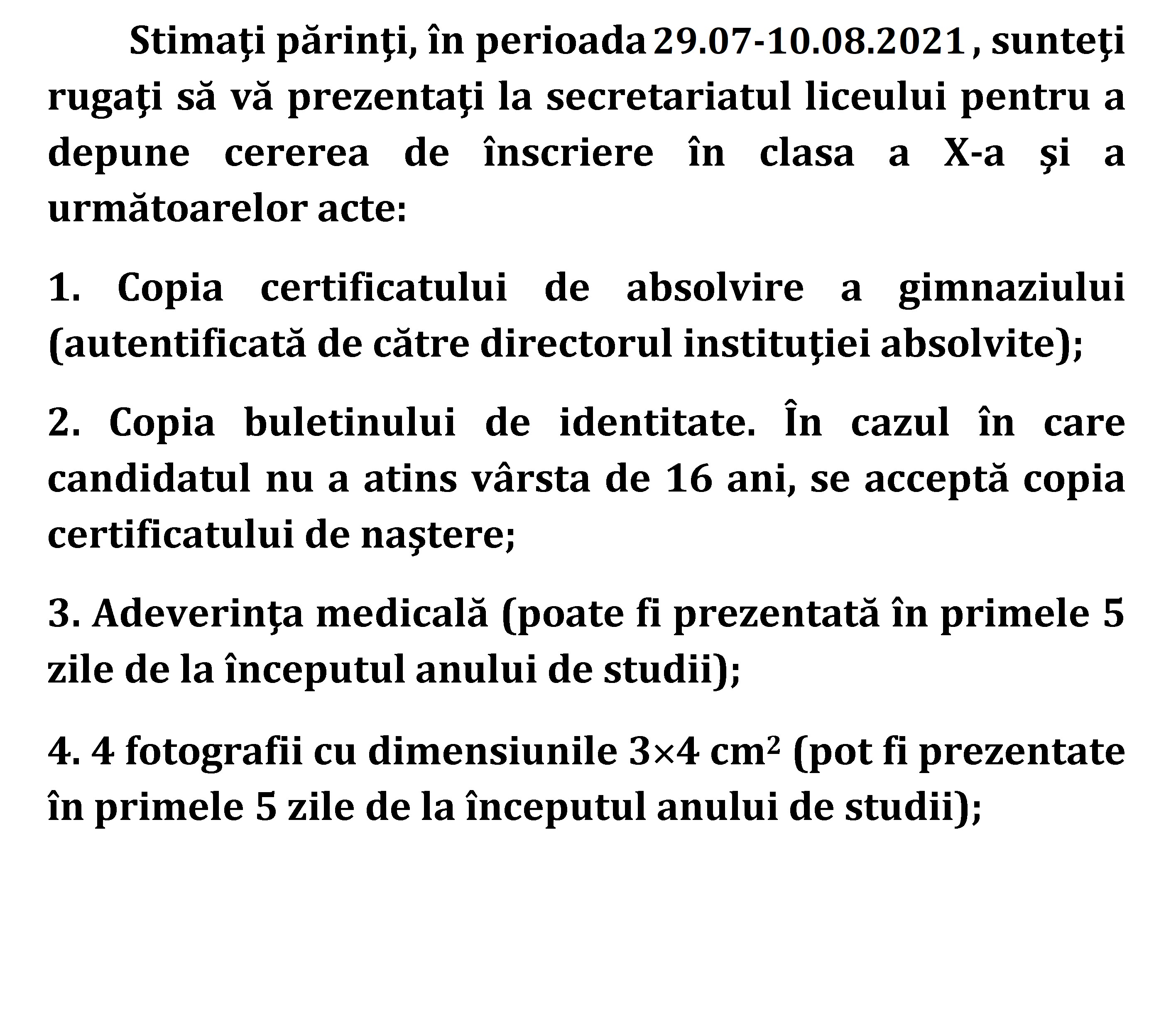 2021-07-29 ÎN ATENŢIA PĂRINŢILOR CANDIDAŢILOR ADMIŞI ÎN CLASA a X-a ÎN INSTITUŢIA PUBLICĂ LICEUL TEORETIC "SPIRU HARET", ANUL DE STUDII 2021-2022!