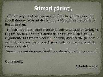 Stimaţi părinţi, având în vedere situaţia actuală, la solicitarea Du...