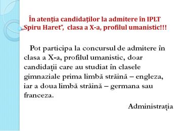 ÎN ATENŢIA CANDIDAŢILOR LA ADMITERE ÎN CLASA A X-a, PROFIL UMANISTIC!!!
