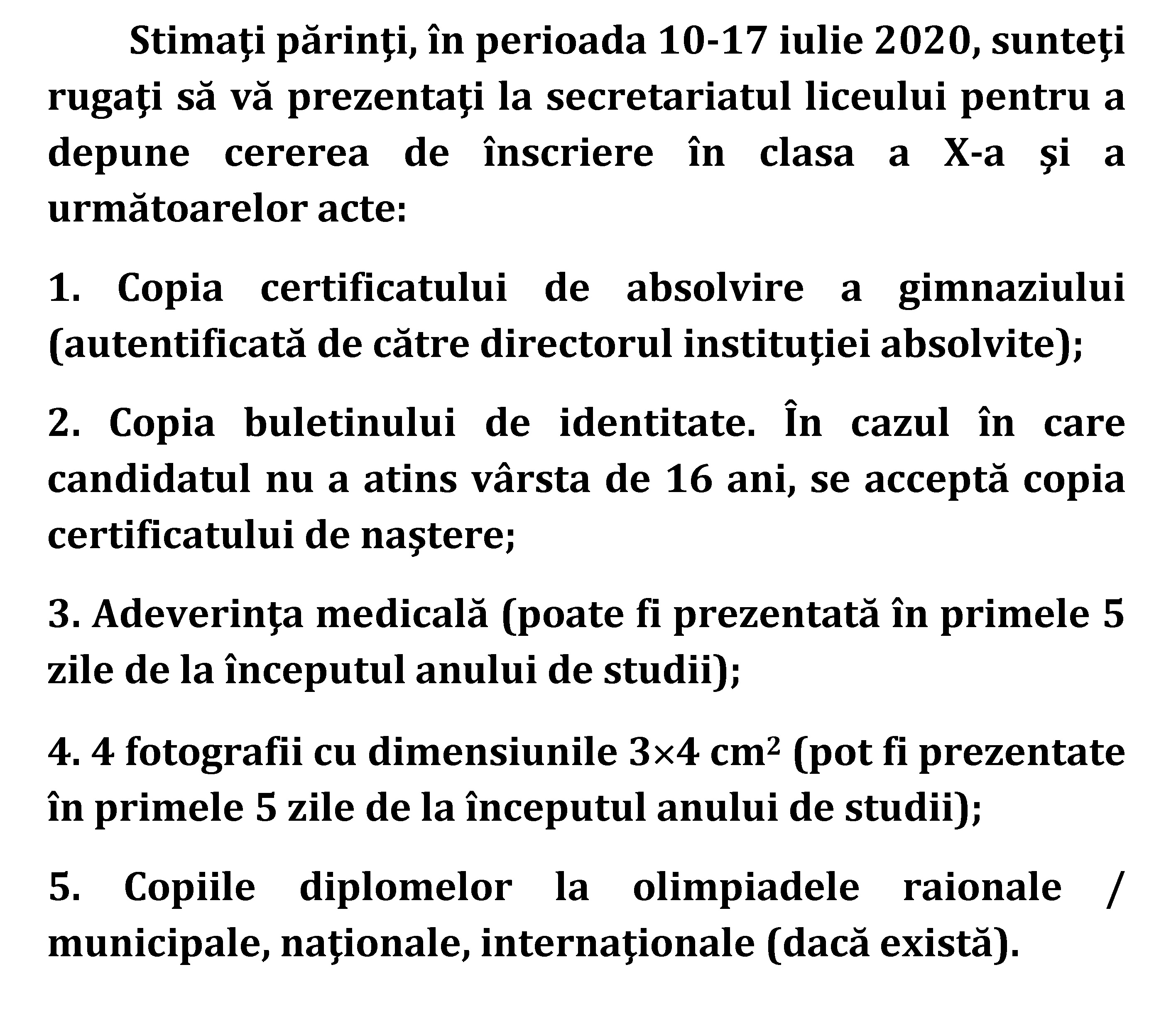 2020-07-09 ÎN ATENŢIA PĂRINŢILOR CANDIDAŢILOR ADMIŞI ÎN CLASA a X-a ÎN INSTITUŢIA PUBLICĂ LICEUL TEORETIC "SPIRU HARET", ANUL DE STUDII 2020-2021!
