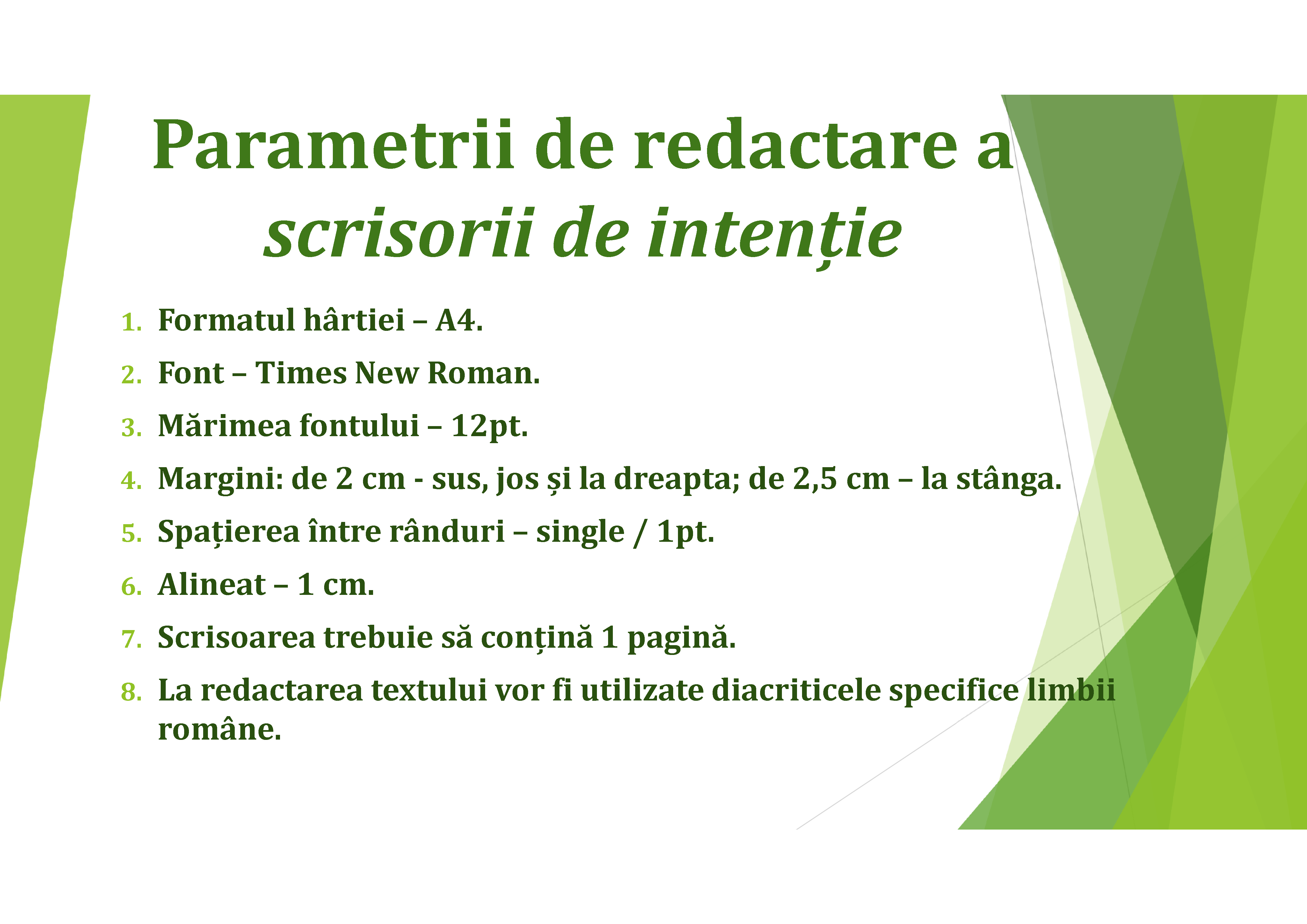 La cerere, vă rugăm să anexați și o scrisoare de intenție cu respectarea următorilor parametri: